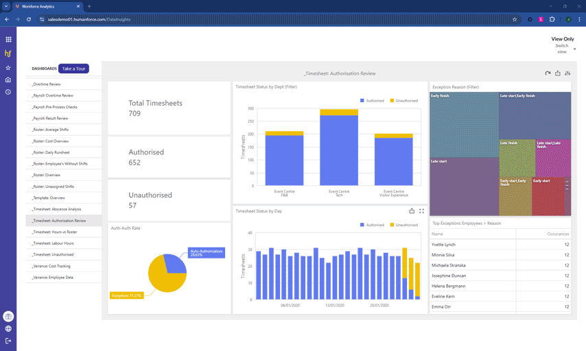 Leisure business managers who head multiple departments in different locations can view key metrics such as absenteeism rate, tardiness, labour costs, shift acceptance rates, and many more, all via the same dashboard.