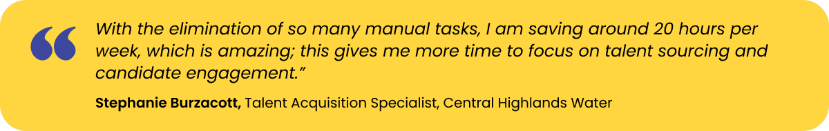 Improved efficiency and time savingsIn a very short time, Humanforce Talent has dramatically reduced the time spent on administrative tasks. Previously drafting and posting job ads took one hour, now with Humanforce Talent it takes just 5 minutes! “With the elimination of so many manual tasks, I am saving around 20 hours per week, which is amazing; this gives me more time to focus on talent sourcing and candidate engagement,” said Stephanie.